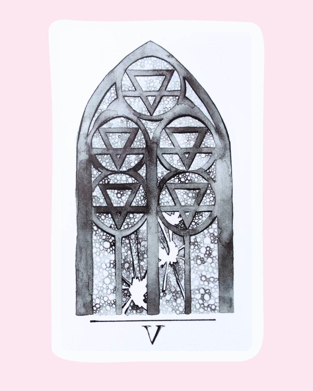 Take a moment to look at the card. Traditionally, it depicts two figures walking through the snow, past a glowin stained-glass window. In my deck, the stained glass window is shattered, breaking the beautiful facade. What do you see? Do you see the struggle of the strom or the proximity to warmth? Is there help waiting, if you looked up to see it?
