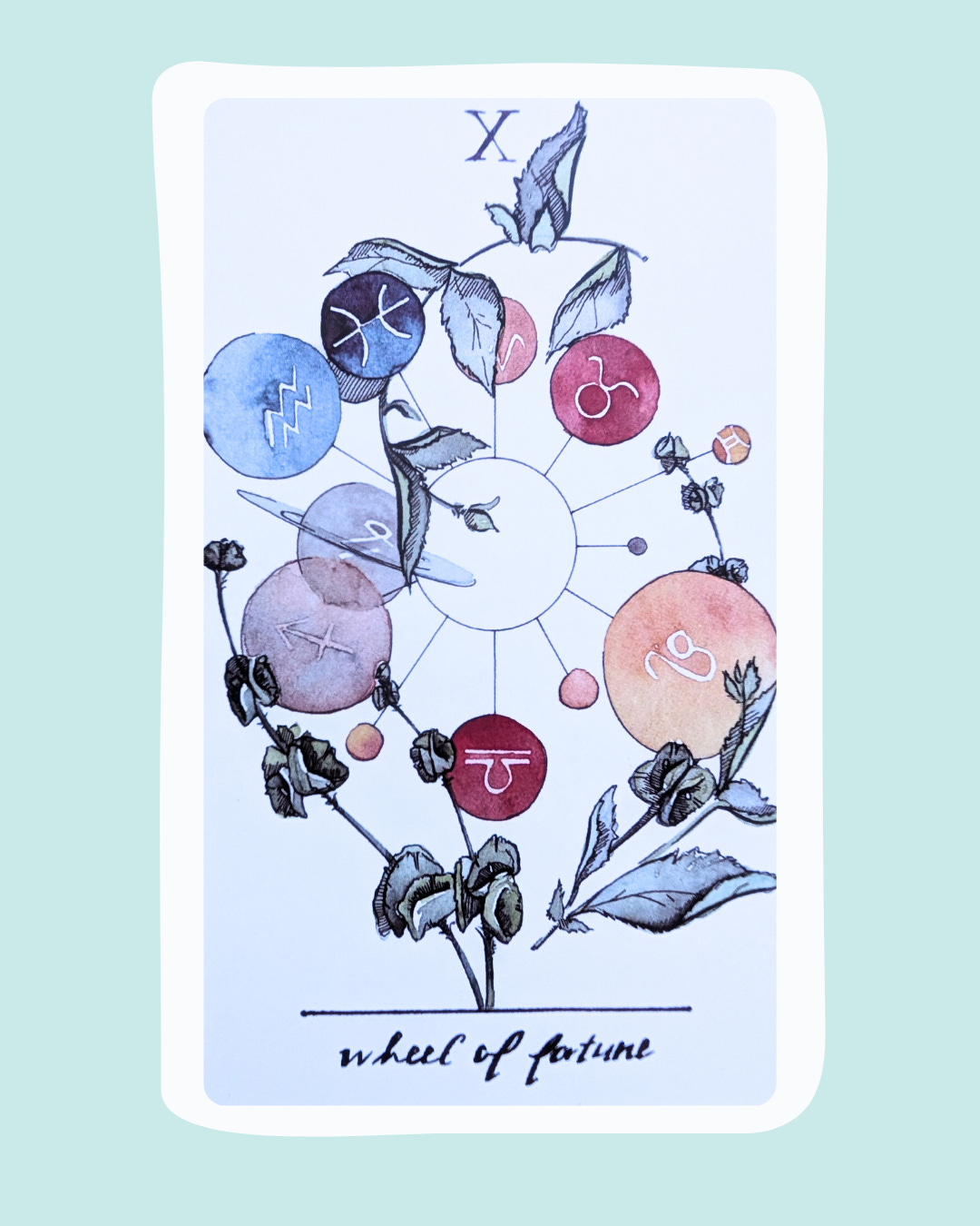 This card is all about the cycles—the unpredictable ups and downs of life. I love this particular card for two reasons: first, its a great reminder that the only premanent feature of life is change, and second, it is a helpful nudge to stop fighting against external forces and insteal lean into the natural cycles taking place in the world.