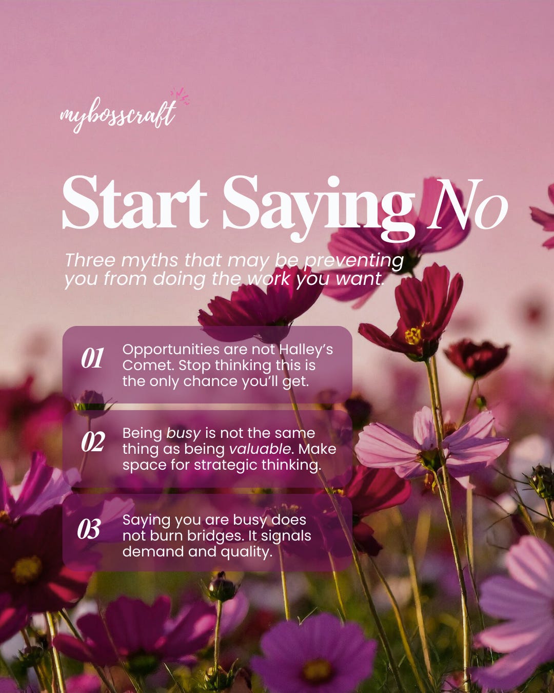 Reality Check: Professional “no’s” actually build respect. They signal that your time is a finite, high-value resource. For organizations, the strategic “no” isn’t a door slamming shut; it’s a roped off VIP area. For consultants the same is true: when you tell clients you have limited availability or are too busy to take on a request, you’re telling them that you are a valuable resource that delivers quality work.